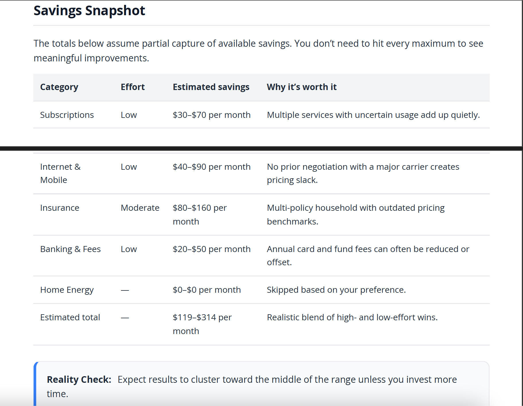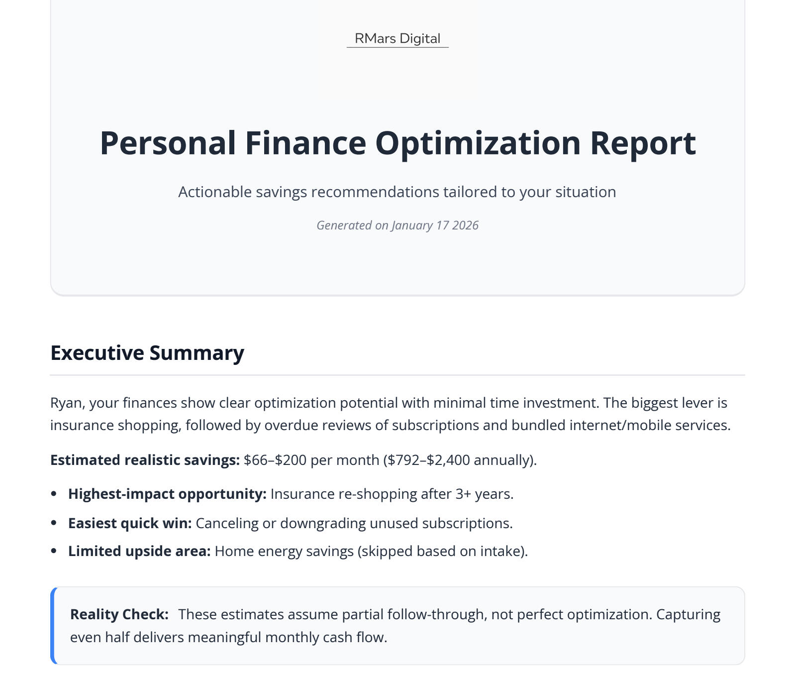 - Category breakdowns with clear recommendations + Reality Checks
