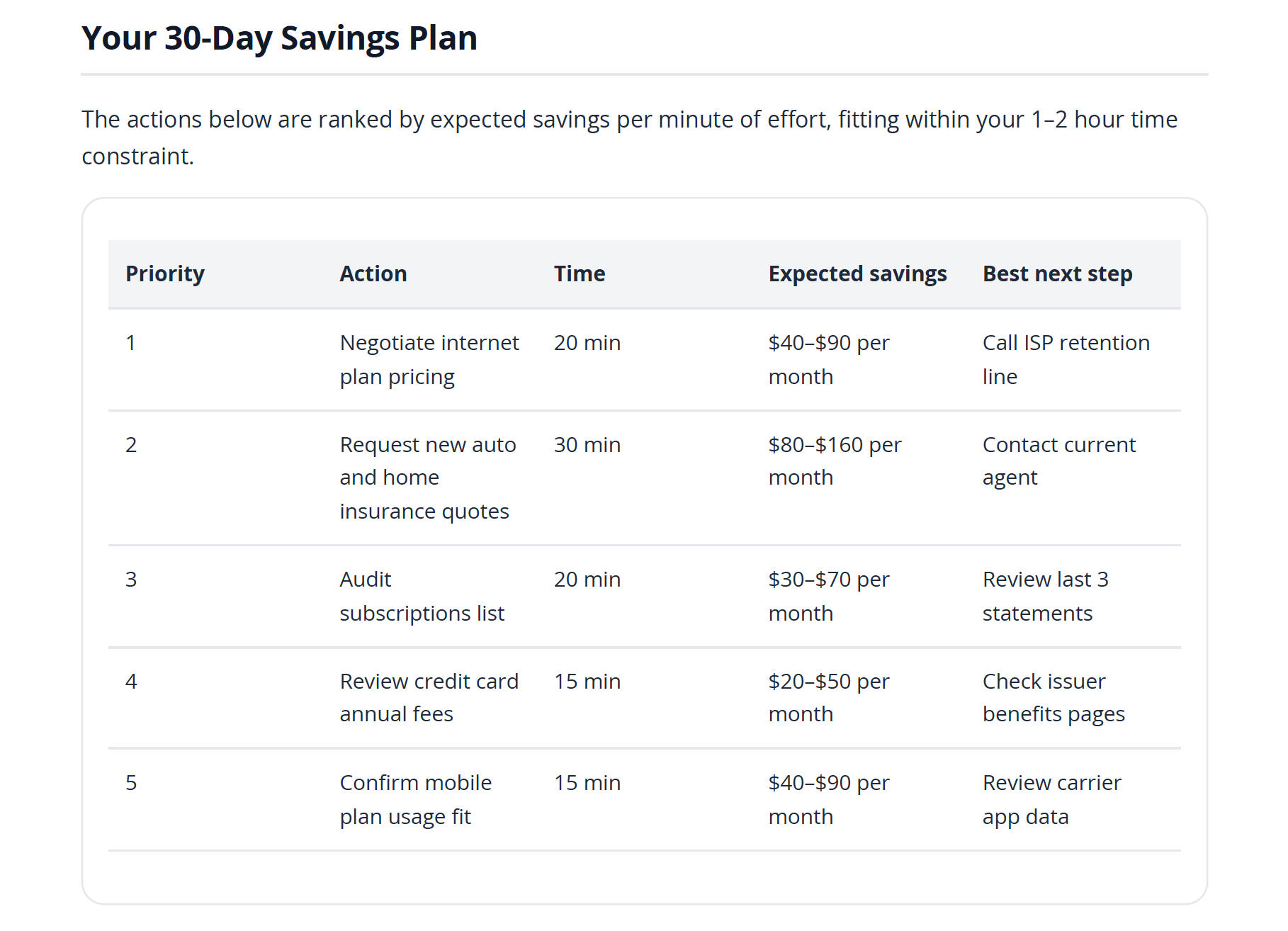 - 30-Day Savings Plan with next steps, time required, and expected savings